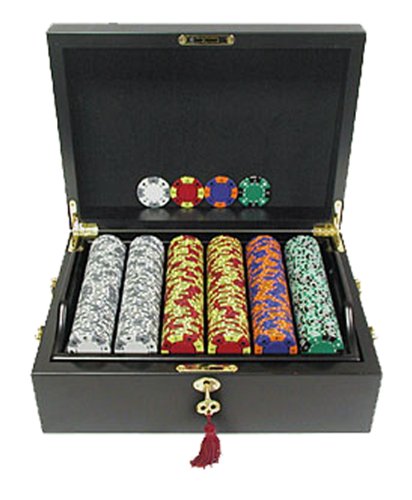 These 39 mm diameter casino sized chips are 11.5 grams in weight. They are produced from a composite resin and an insert that gives them the weight feel of a heavy casino quality chip. The detail on these chips is flawless and their unique design makes them great for casinos and homestyle play alike.What makes this set the best in the country, is the rich mahogany case that holds the chips. This beautiful dark mahogany poker chip case is one of the finest cases we have ever sold. At first glance it may resemble a fine cigar humidor. It is a deep reddish brown mahogany and is very solid. Made of 1/2 inch pieces of solid mahogany wood, this case is as solid as could be. The finish on this case is a smooth polished laquered finish. The tray inside is removeable revealing a bottom layer that holds chips and playing cards. The woodwork on the inside and outside is as fine as any piece of furniture in your house.The hardware on this case is solid brass. There are 2 well built handles that are very strong and artistic in design. The best feature of all on this case is the key lock to keep your poker chips secured. The key itself is artistic and also fits in with the decor. It is an old style key made from solid brass with a tassle hanging from it. This is a collector's item as well as a fully functional chip case for the person who appreciates the finer things in life. For a finishing touch on this fine piece, there is a solid brass name plate that is ready for engraving (engraving not offered). Once you receive this case you will want to get the name plate engraved and then you can easily mount it on the case as it has an adhesive surface on the back. The top rack in this case comfortably holds 300 chips as the bottom rack holds 200 chips for a total chip capacity of 500 chips. Also on the bottom there is enough space for 3 decks of cards. The case is 12 3/4 inches by 9 3/16 inches and stands 5 inches high when in the closed position.